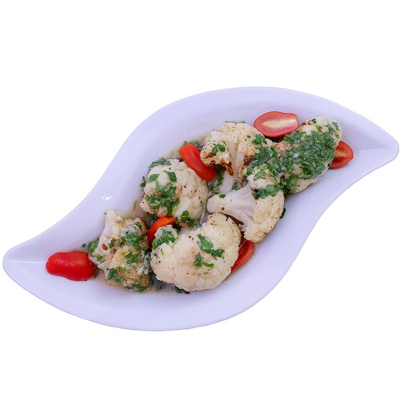 Pan-roasted cauliflower with garlic, coriander, and black pepper. Crisp, flavorful, and endlessly scoopable. 111Kcal • C10g • P2g • F7g