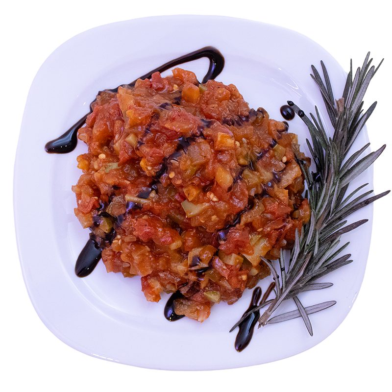 A vibrant medley of zucchini, peppers, eggplant, and cauliflower in basil-scented olive oil. Rustic, French, and full of veggie power. 93Kcal • C10g • P2g • F5g
